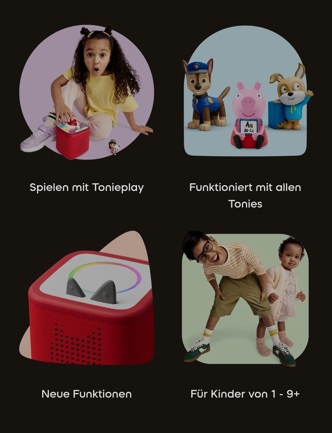 Die Toniebox bietet unbegrenzten Hör-Spiel-Spaß: Mit Tonies, Clever Tonies, Book Tonies und Kreativ-Tonies können kleine Entdecker*innen in ihre Lieblingsgeschichten eintauchen. Und die Toniebox 2 bietet sogar doppelten Spielspaß: Mit Tonieplay können Kinder bildschirmfreie, interaktive Spiele, Quizze und Herausforderungen erleben.